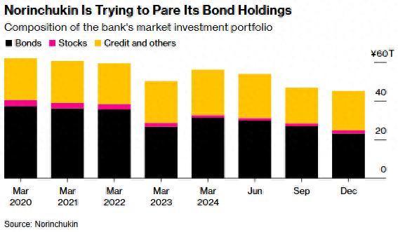 上个月,一个政府专家小组敦促Norinchukin将其以债券为主的投资组合多样化,并引入更多外部人才。报告称,与同行相比,该行对市场的敞口过大,证券投资占其收入的80%。日本大型银行的这一比例约为20%。